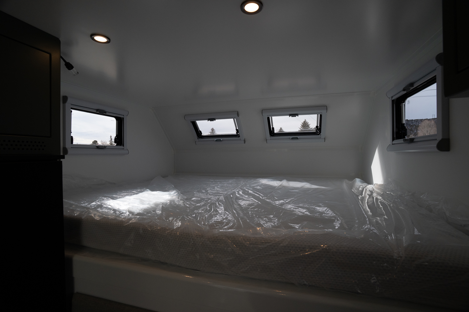 When selected we’ll install two windows on the front panel (where the Outpost symbol normally is) of the Outpost 6.5 giving you two double pane acrylic windows to provide 270 views from the bed area. Complete with an awning style opening and integrated bug and privacy curtains just like the four other windows that come standard on the Outpost 6.5.